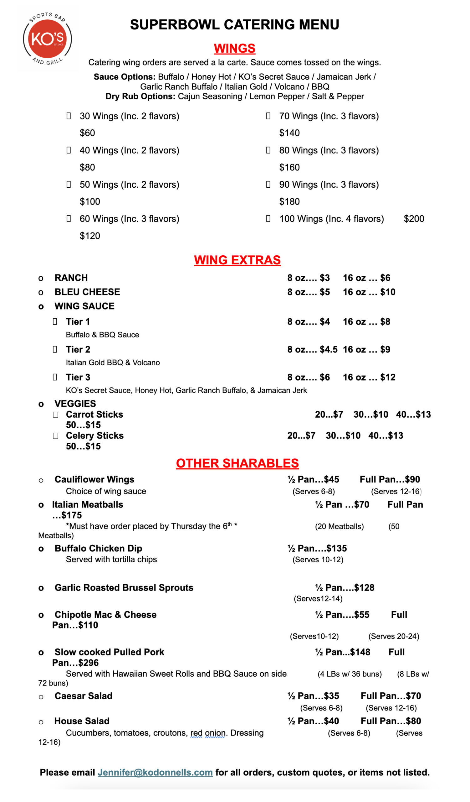 CATERING MENU FOR THE BIG GAME Email jennifer@kodonnells.com to place your order. Orders must be placed by Wednesday, February 4th. Day-of orders will not be accepted. DOWNLOAD PDF