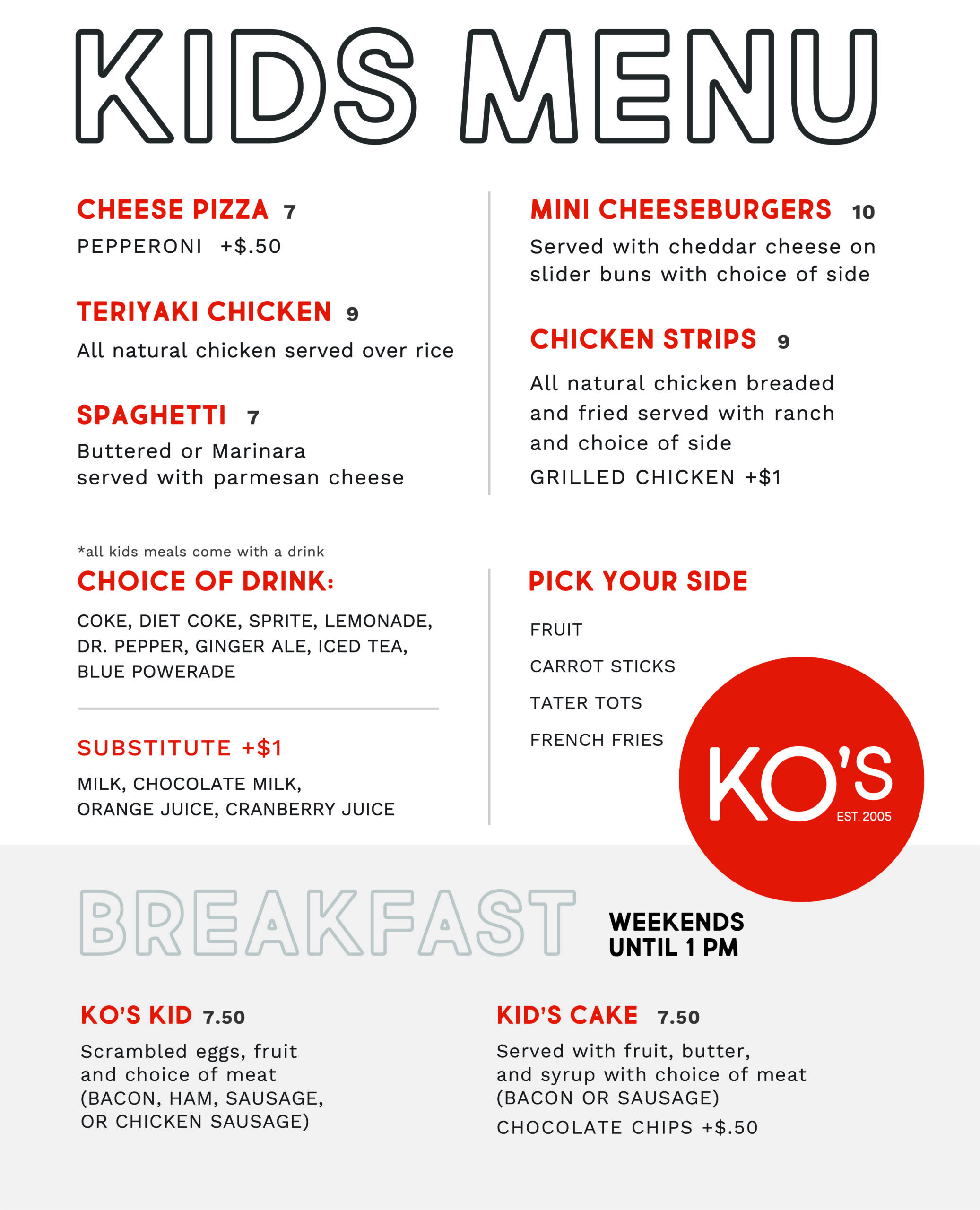 KO’S KID’S MENU Our kid’s menu is available for all kids who want to have food & fun at K O’Donnell’s and are ages 10 and under. All of our lunch and dinner options come with a kids soft drink. DOWNLOAD FULL MENU